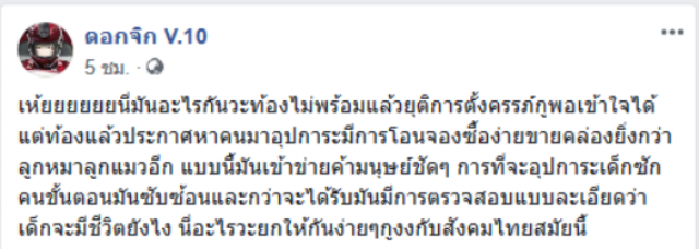 เป็นเรื่องที่แชร์ต่อกันเป็นจำนวนมากในโลกออนไลน์ เป็นการขายทารก แรกเกิดมีการโอนจอง ซื้อง่ายขายคล่องแบบไม่เกรงกลัวต่อกฏหมาย เมื่อวันที่ 10 กันยายน เพจ ดอกจิก V.10 ได้โพสต์ข้อความระบุว่า เห้ยยยยยยนี่มันอะไรกันวะท้องไม่พร้อมแล้วยุติการตั้งครรภ์กูพอเข้าใจได้ แต่ท้องแล้วประกาศหาคนมาอุปการะมีการโอนจองซื้อง่ายขายคล่องยิ่งกว่าลูกหมาลูกแมวอีก แบบนี้มันเข้าข่ายค้ามนุษย์ชัดๆ การที่จะอุปการะเด็กซักคนขั้นตอนมันซับซ้อนและกว่าจะได้รับมันมีการตรวจสอบแบบละเอียดว่าเด็กจะมีชีวิตยังไง นี่อะไรวะยกให้กันง่ายๆ งงกับสังคมไทยสมัยนี้