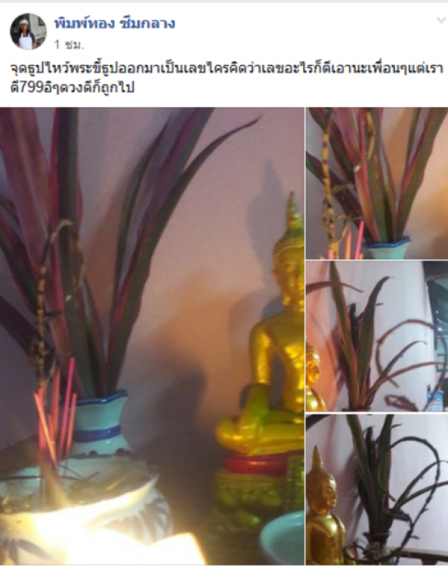 ใกล้เข้ามาทุกทีแล้วจ้า สำหรับการประกาศผลรางวัล สลากกินแบ่งรับบาลประจำวันที่ 16 กันยายน 62 ล่าสุดมีผู้ใช้เฟสบุ๊คชื่อ พิมพ์ทอง ซึมกลาง ได้ออกมาโพสต์ภาพผ่านกลุ่มดัง โดยได้ระบุข้อความว่า จุดธูปไหว้พระขี้ธูปออกมาเป็นเลขไครคิดว่าเลขอะไรก็ตีเอานะเพื่อนๆแต่เราตี799อิๆดวงดีก็ถูกไป